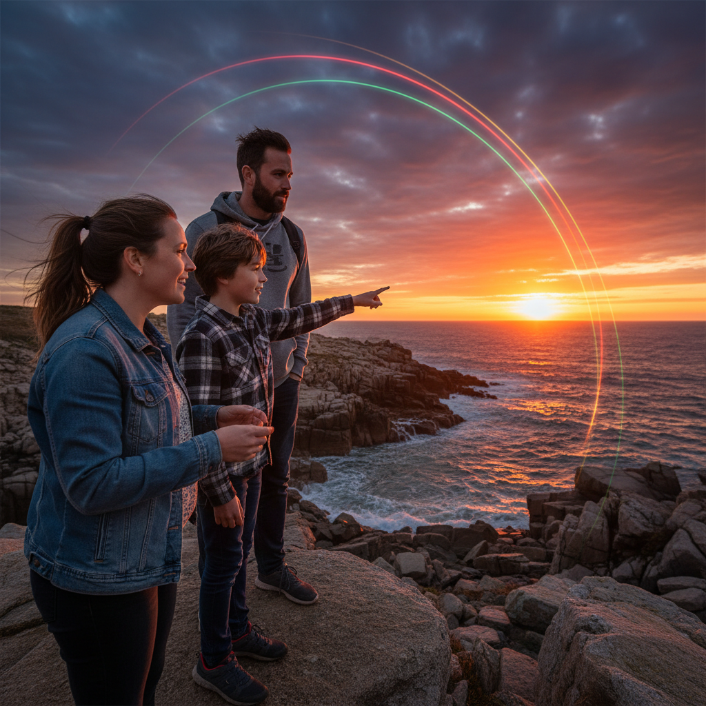 L’émerveillement d’une famille devant un coucher de soleil spectaculaire et des phénomènes lumineux inexpliqués sur une côte rocheuse. Une illustration parfaite du ‘Pourquoi’ derrière l’awe des Phénomènes Naturels 2026.
